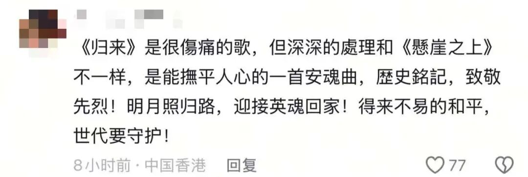 “中秋团圆日,不忘捐躯人。”微记录《守望》以英雄黄继光后人的讲述把那段烽火岁月拉近,《回家》《归来》,还有《五月的鲜花》《任时光流逝》《玫瑰人生》,经典的旋律将铭记历史、缅怀先烈、珍爱和平、开创未来的主题内化为流淌到心里的音符。网友点赞秋晚:“歌曲编排结合中外经典曲目,这样致敬英雄,深情又不流俗,节目组有心了!”