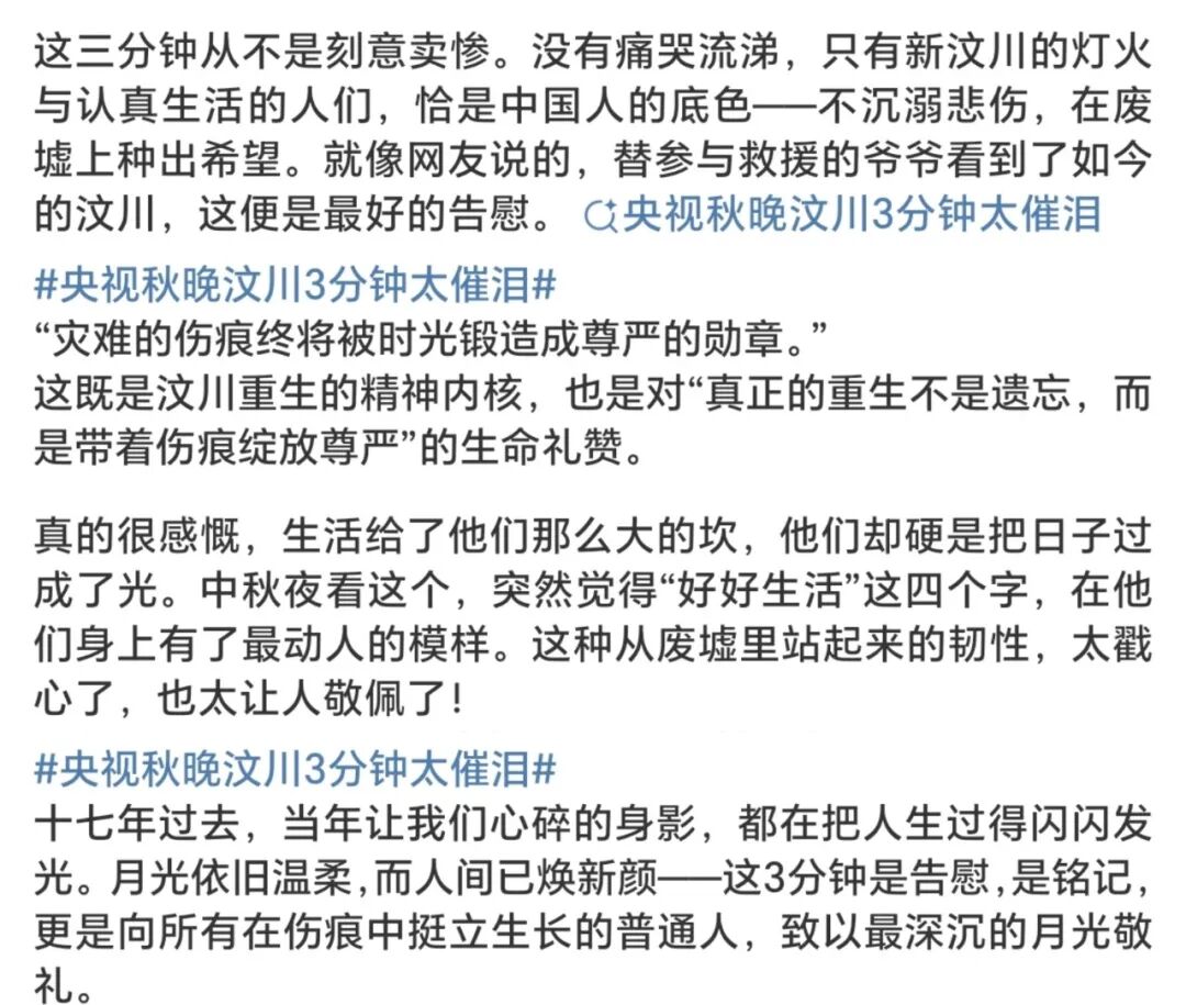 “看完秋晚更爱家乡了,也更爱生活了。”一幕幕德阳元素浮现,带观众从陌生中看出熟悉,更从熟悉中看出亲切。微纪录《新生》里的汶川故事更让许多网友在泪目中拥抱生活、温暖前行:“片子催泪但不煽情,平实的讲述就是有力的致敬”“从废墟中站起来的韧劲,太让人敬佩了”“灾难的伤痕终被时光锻造成尊严的勋章”……